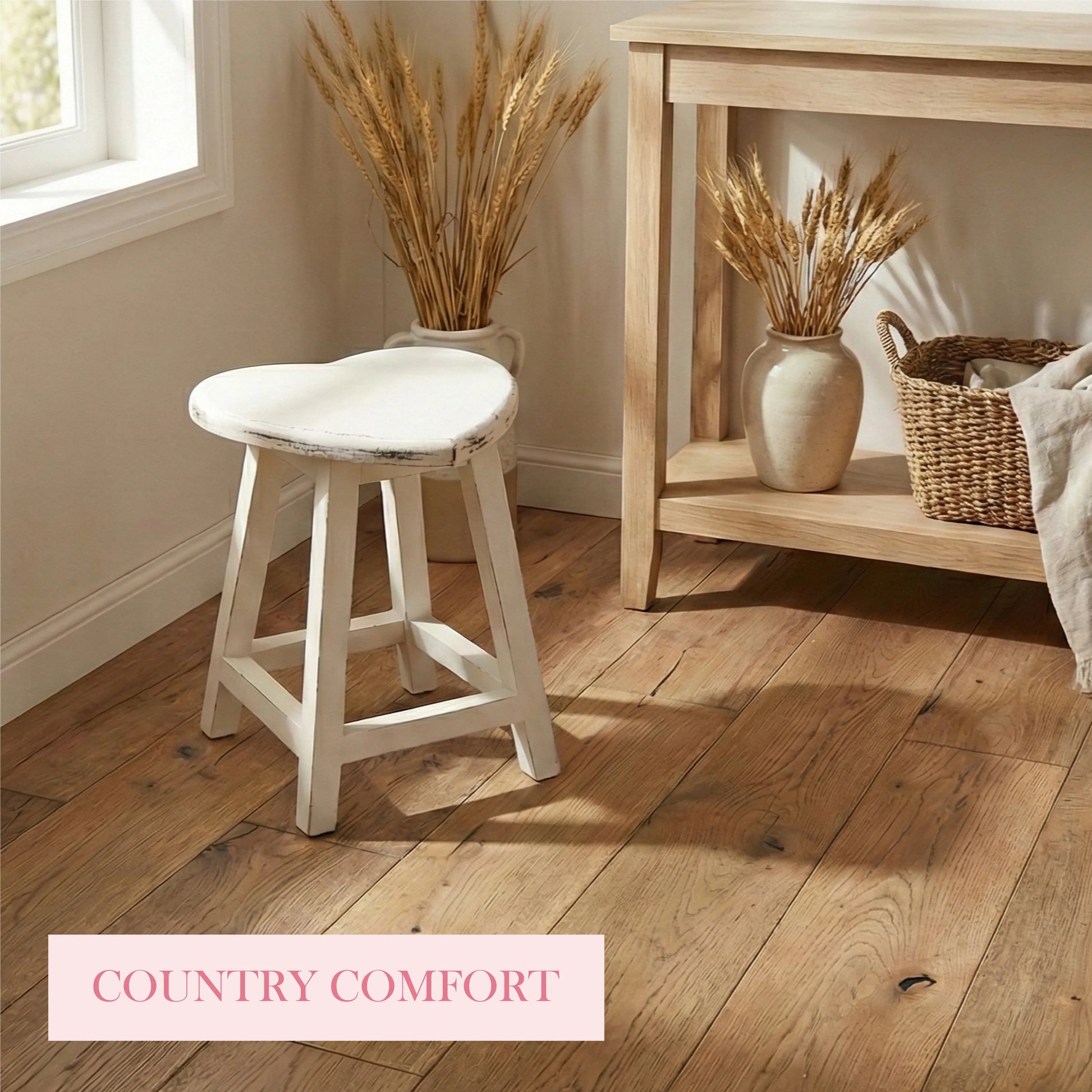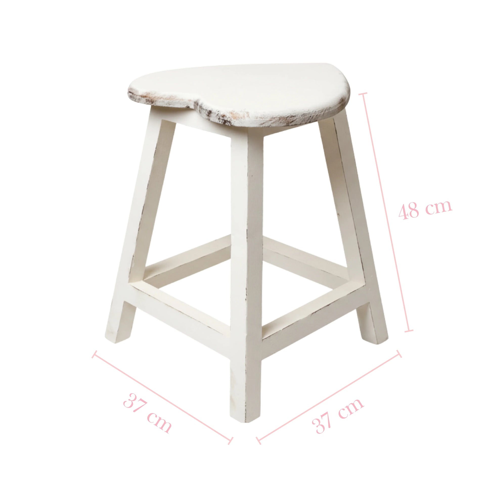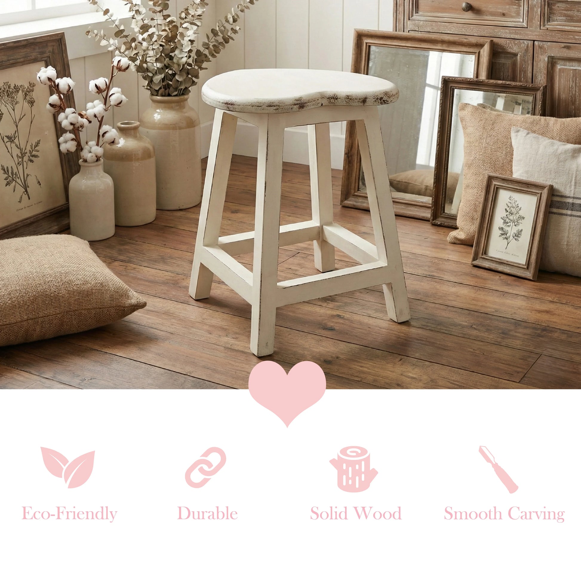 أضيفي لمسة من الرقي الريفي مع كرسي خشبي على شكل قلب مطلي بلمسة أنتيك بيضاء. مثالي للمطبخ أو كمقعد زينة.