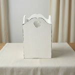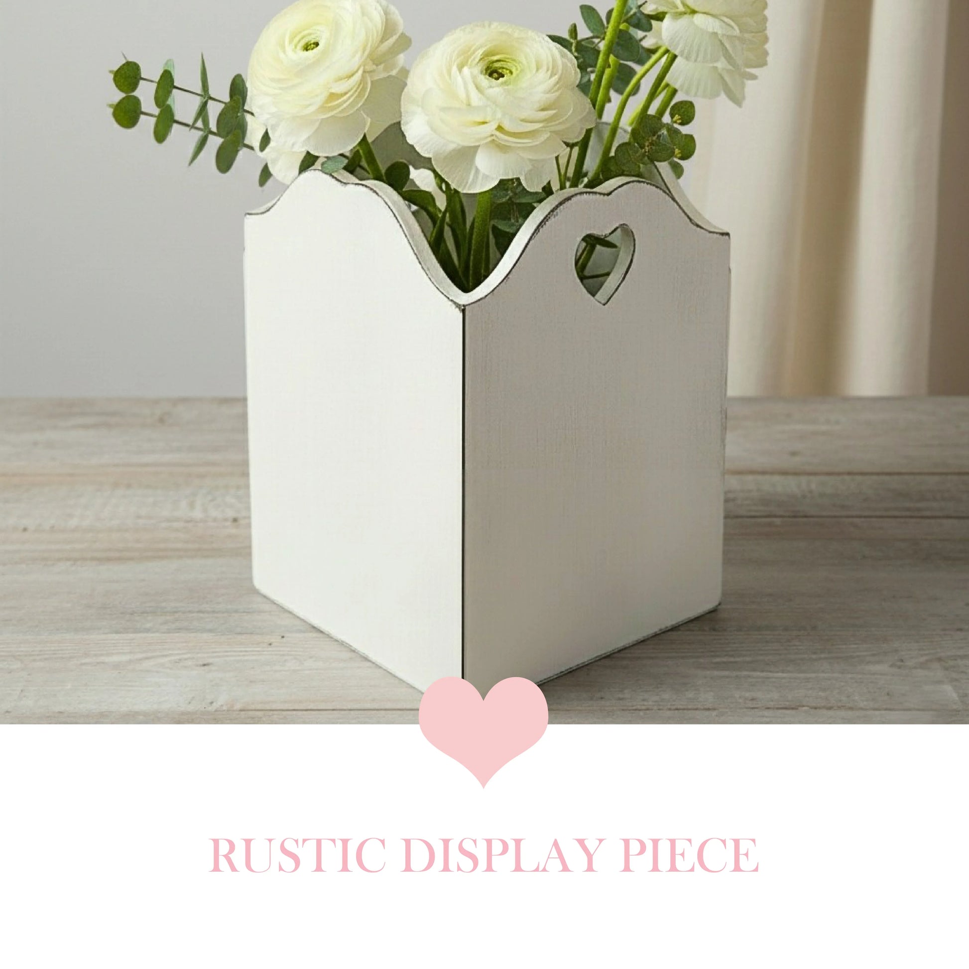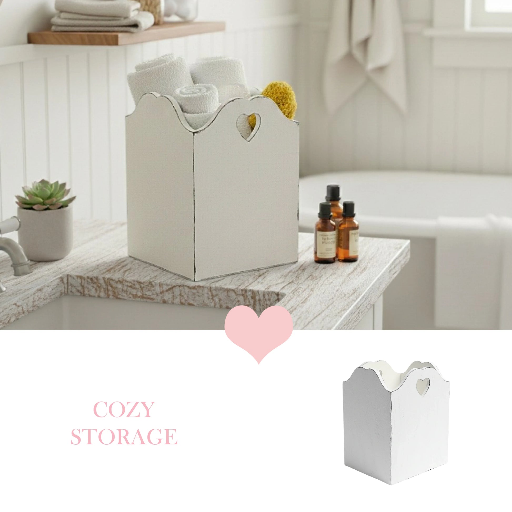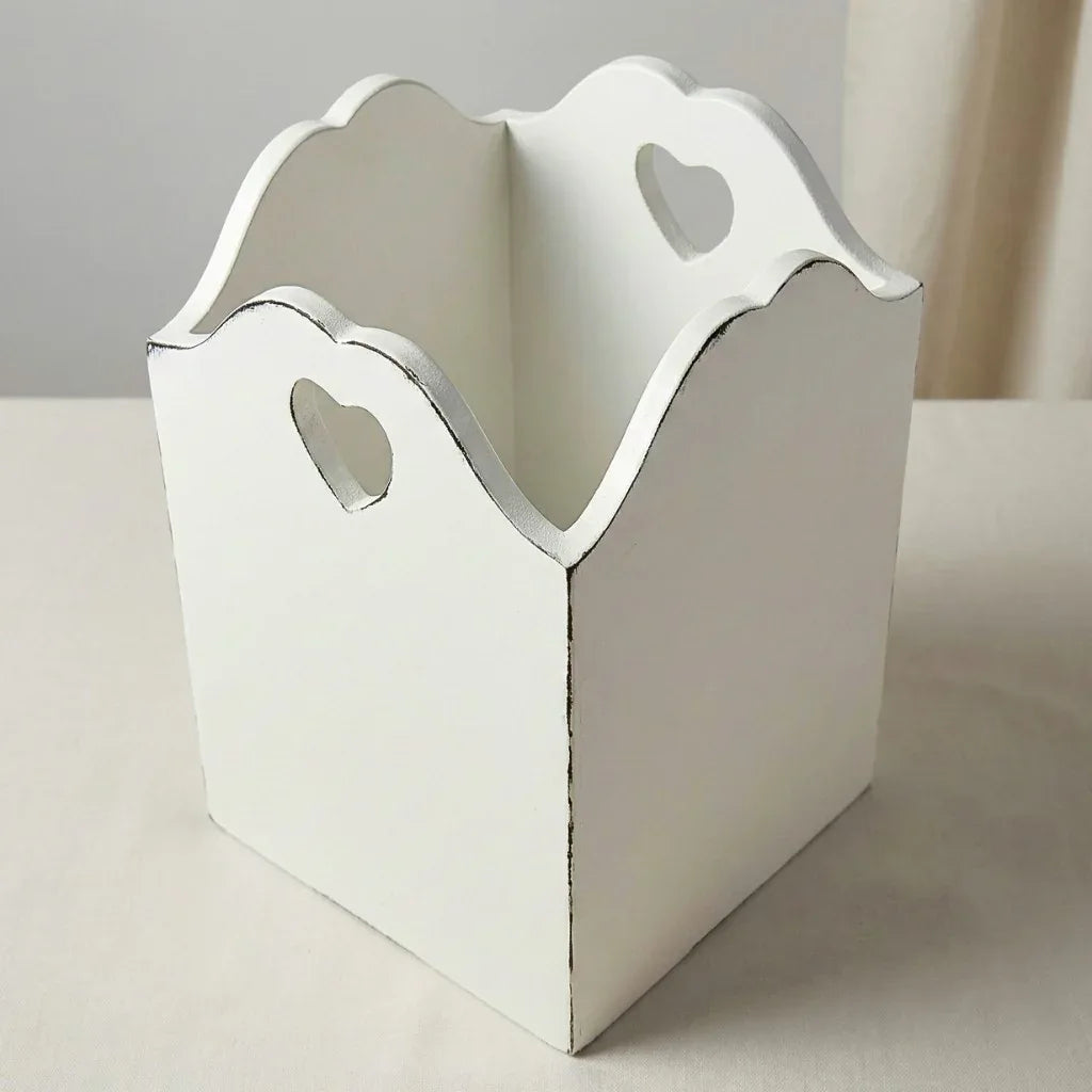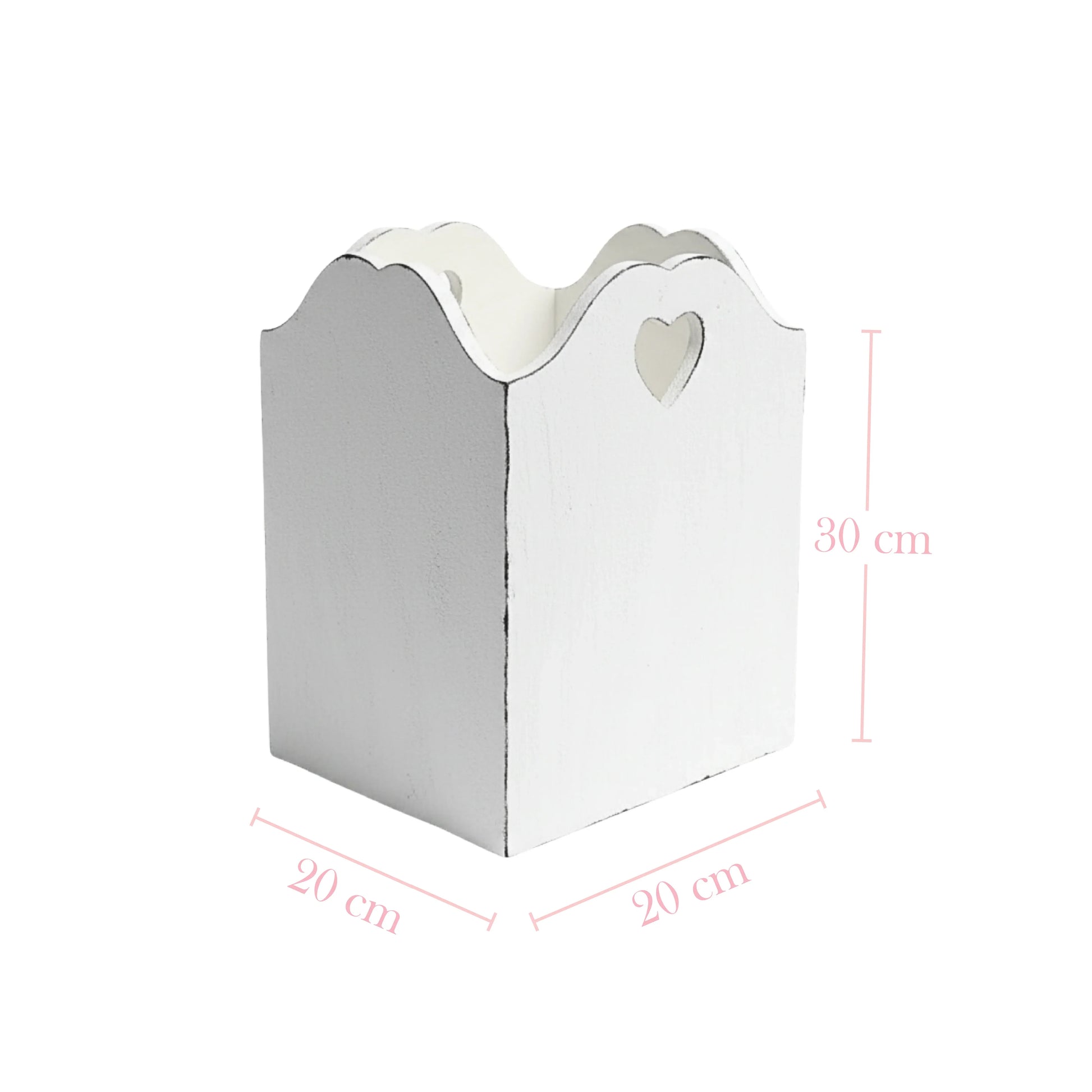 نظمي أغراضك بأسلوب ريفي أنتيك مع سبت خشبي مزين بقلوب محفورة وحواف مموجة. عملي وأنيق لمفارش أو الزهور أو كسلة مهملات أنبقة.