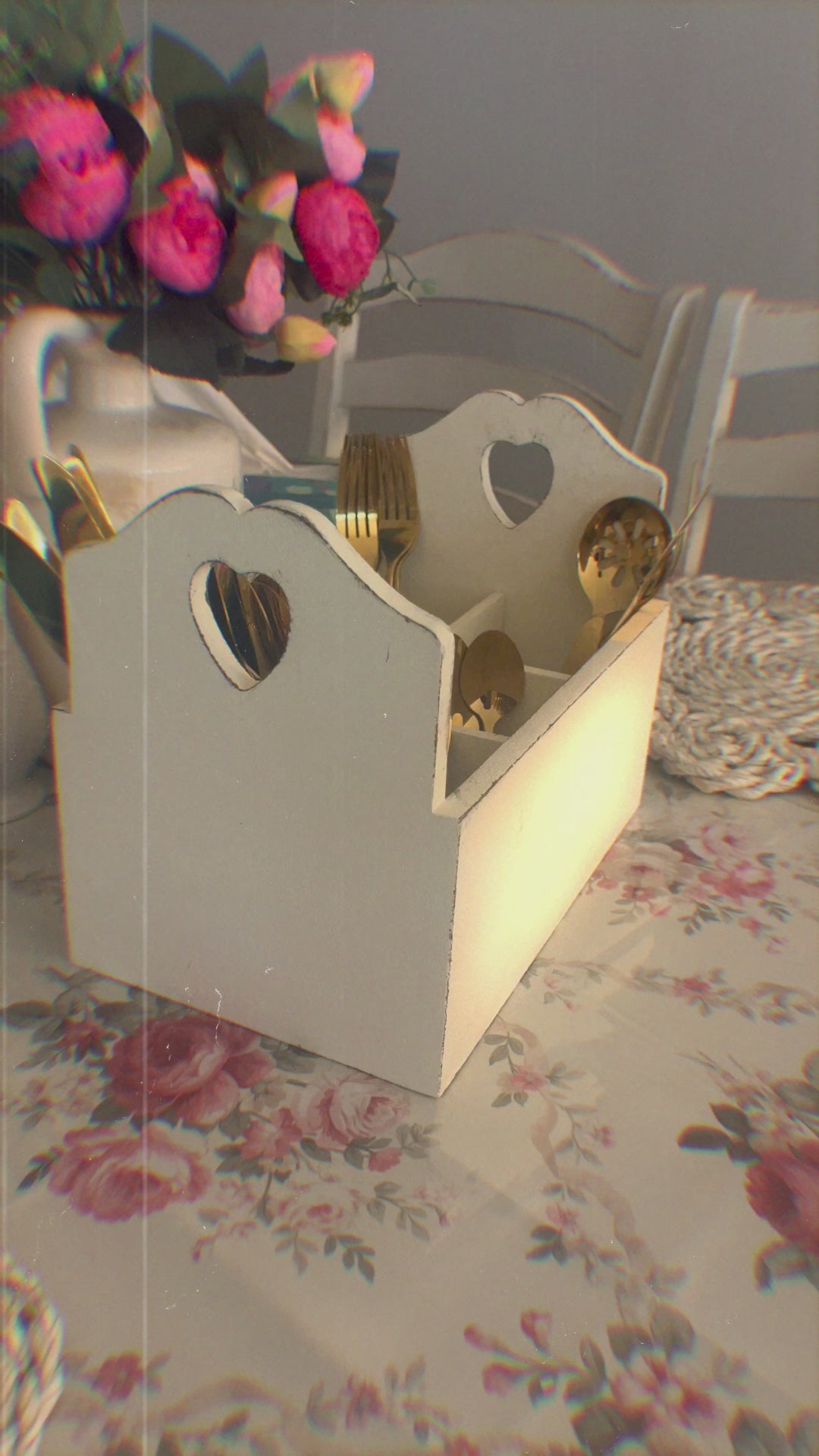 Elevate your dining experience with our Country Charm Flatware Holder. Featuring heart-shaped cut-outs and rustic finishes, it blends practical storage with country elegance for your table.