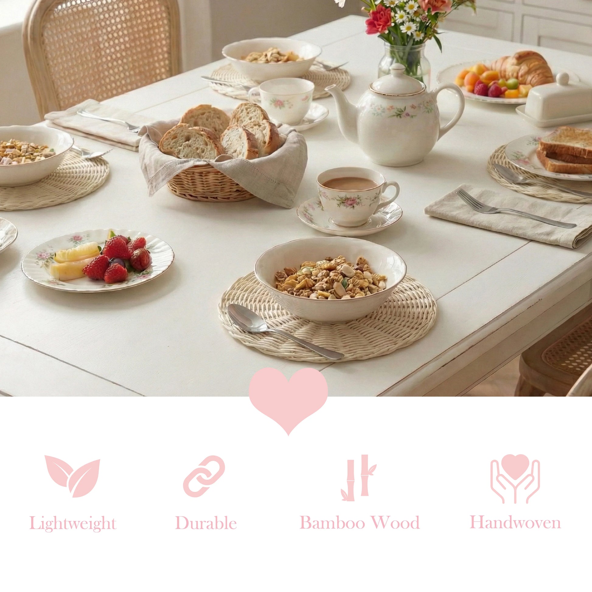 • Styling tip: Pair with matching wicker coasters for a cohesive country table